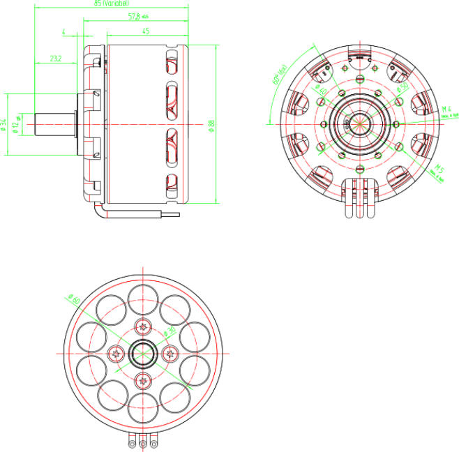 Länge | Lenght 57,5 mmLänge | Length incl. Shaftab 125 mmDurchmesser | Diameter88 mmWelle | Shaft 12 mmLochkreis | Screw-hole circle 30 mmZentrierbund | Locator34 x 4 mmGewinde | Thread of screwM 5Gewicht | Weightab 1500 gLeistung | Power4000 Watt / 6000 Watt 10 sec.Wirkungsgrad | Efficiency>90 %Spannung | Voltagebis zu 100 V o. 16s LiPo je nach WicklungStrom | Current bis zu 200 A je nach WicklungKonfiguration | Config12N14P / 12N10PPropbis zu / up to 30”Die Prop-Adapter stehen in zwei verschiedenen Längen zur Verfügung.Für diese Motormodelle sind Sensorplatinen und div. Getriebeadapter verfügbar...